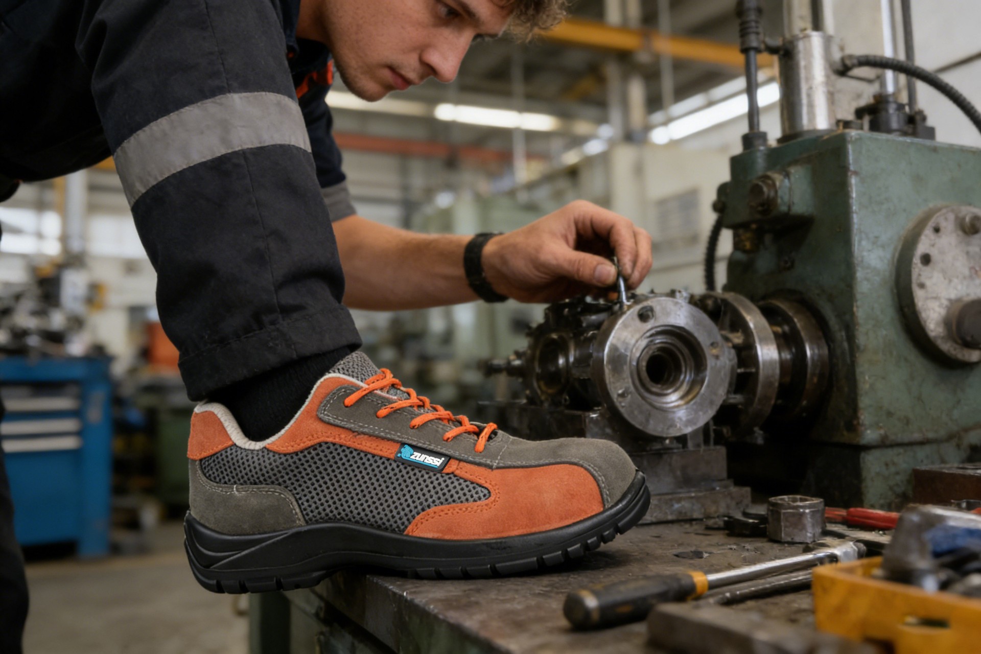 采用头层绒面牛皮 + 3D双层抗菌耐磨网布鞋面, 360°空气内循环系统,能快速排出鞋内热量,橙色反光设计、夜间工作也安全,采用confort@技术的纺织衬里,更耐脏、可控制鞋内的空气环境,保持足部干爽。巴斯夫聚氨酯防滑外底。爬坡,爬梯完美抓着。引导双脚的休闲运动,从而减少疲劳,更好地保护穿着者的能量。PU-PU外底采用全新的“梁柱”技术,提供更佳支撑,确保外底极其耐用和减震。这些安全鞋具有灵活的灵活性,适应性和较高抓地力,远超过SRC标准.