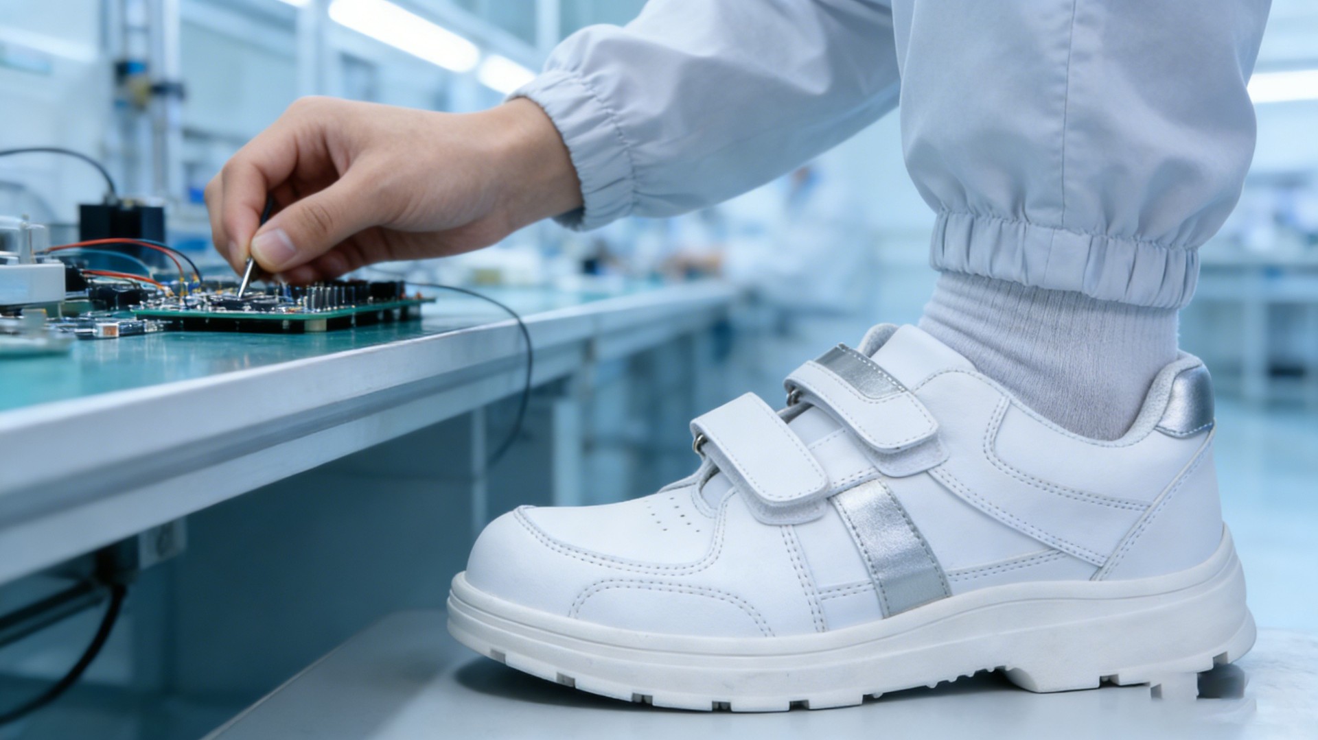 专业针对医药、电子,食品、医疗,等洁净环境设计。白色进口牛皮帮面设计,白色聚氨酯防滑大底+360度空气内循环系统保证鞋内空气凉爽,用CoolComfort⑧技术的纺织衬里,可控制鞋内的空气环境。创造洁净空间